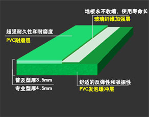 ⒊ 玻璃纤维加强层起到稳定场地尺寸、延长使用寿命的作用,使地板永不收缩,性能更加稳定,使运动员发挥出更好的水平。